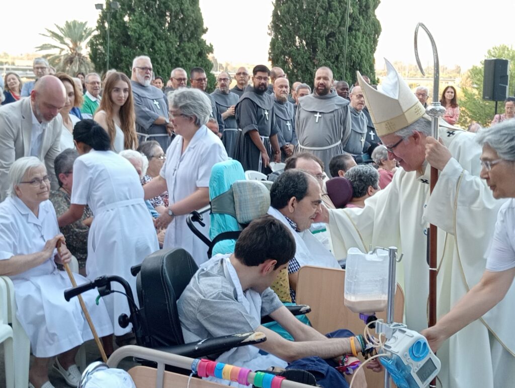 El primer contacto directo con la Institución fue con motivo de la celebración del 70 aniversario de la fundación de la casa sevillana, Regina Mundi, el 28 de mayo de 2024. Una representación de la Junta de Gobierno, encabezada por su Hermana Mayor y acompañados del Sr. Cura Párroco, asistió a la eucaristía de acción de gracias celebrada en el jardín de la casa y presidida por el Sr. Arzobispo, D. José Ángel Saiz Meneses. Allí no solo conocimos a las hermanas y a los residentes acogidos, sino que además pusimos en conocimiento del Sr. Arzobispo la idea de colaborar con Regina Mundi con motivo de la Obra Social de la Coronación Canónica de Nuestra Señora del Amparo, lo que acogió de muy buen grado.